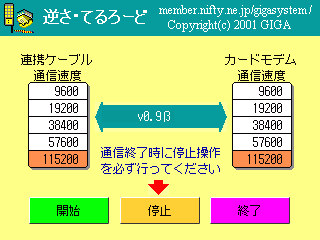 | 2. | 環境設定について パソコン側にザウルスで使うPALDIO611SやP-inComp@ctのモデムがインストール済みの場合は新たに同名のモデムを追加してください。(異なるモデムの場合は初期設定エラーが生じるために利用できません) インストール済みで無い場合はカードを差さないでモデムを追加して下さい。 いずれも自動検出させないで手動でINFファイルを指定しCOMポートは連携ケーブルを選んで下さい。(通信速度は115200を選択) 「逆さ・てるろーど」を起動したときの通信速度は115200です。選択状態は保存されません。 パソコン側の[モデムのプロパティ]、[検出結果]で[詳細情報]を見るときは全ての通信速度を9600に統一して下さい。 連携ケーブルは回線接続状態を検知する信号線がありません。相手先から切断されたときにはパソコン側のダイヤルアップ接続を手動で切断して下さい。(推奨:通信終了の都度、本ソフトの終了ボタンを操作する) 「てるろーど V2.0以降」の着信モデムで使うときは「てるろーど・着信デバイス設定・ノーキャリア検出切断」の「する」を選択して下さい。 |
