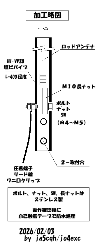 適当に穴をあけるだけで簡単、電動ドリルは必須です。ロッドアンテナを含む加工略図に記述している材料の総費用は約5K円弱でした。