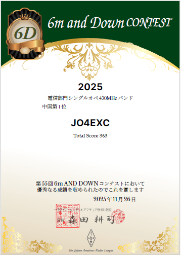 1か月前の結果発表を今日知りました。フル参加できずに入賞をあきらめていたぶん嬉しさが増します( 参加時の記事は こちら )。これで2025年のJARL国内4大コンテストのうちFDのみ不参加であとは入賞できたことになります。