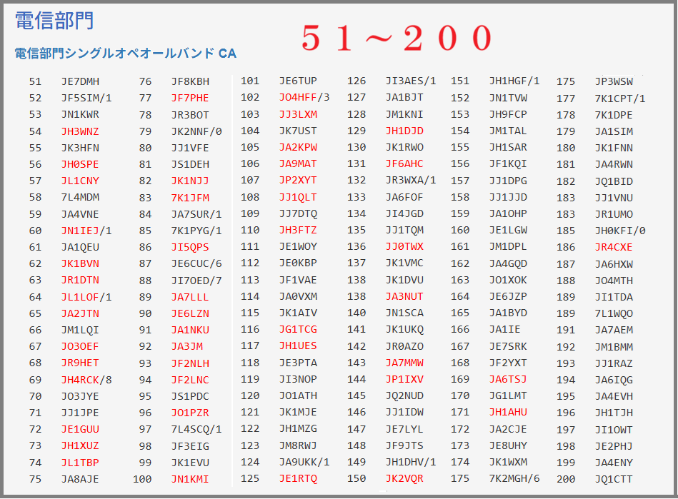 参加部門C35(3.5MHz電信)とCA(オールバンド電信)のログ提出局コールサインをアプリ( CQHLQRV 新版近日公開予定 )で色分け表示をして取りこぼし度合を確認しました。(下のキャプチャ画像参照)